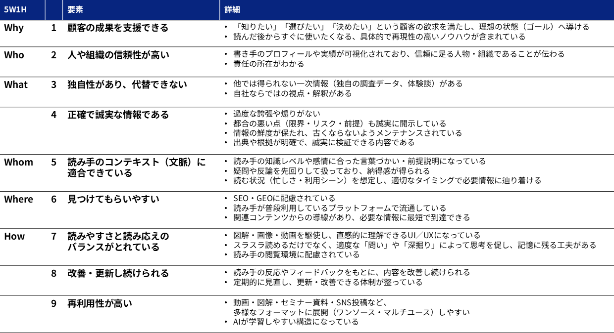 私たちウェブライダーでは、高品質なコンテンツに必要な要素を、独自の「5W1H」フレームワークに落としこみ、これらのフレームワークを徹底的に意識して制作を進めています。