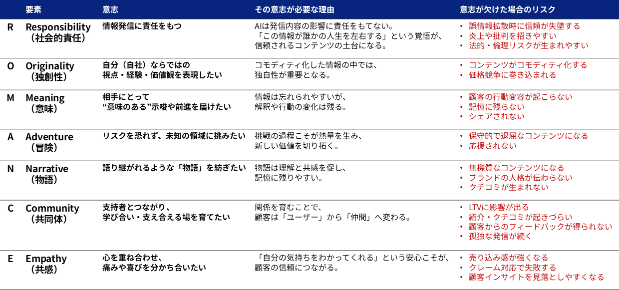 なぜならAIには「コンテンツを通して何かを実現したい」という「意志」がなく、以下のROMANCEの観点で人間を超えられないからです。