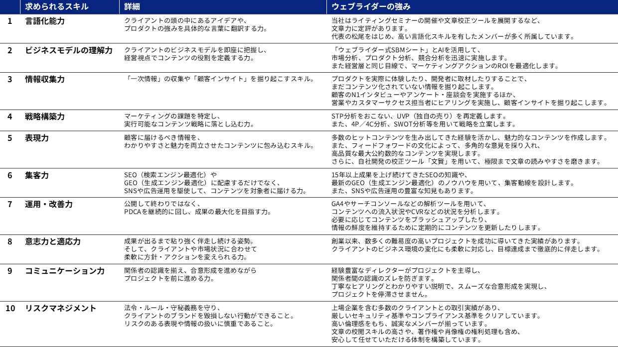 ウェブライダーは15年以上にわたり、SEO・Webマーケティング業界の最前線で成果を上げ続けてきた実績を活かし、GEO(生成エンジン最適化)やLLMO(大規模言語モデル最適化)にも効く、最高品質のコンテンツマーケティングを提供します。