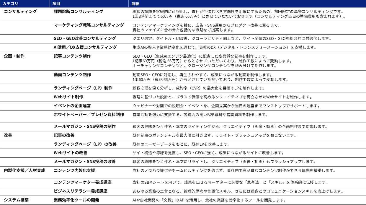 現在、コンテンツ制作だけの受注はおこなっておらず、すべてのコンテンツは「コンサルティング」を通じて制作します。