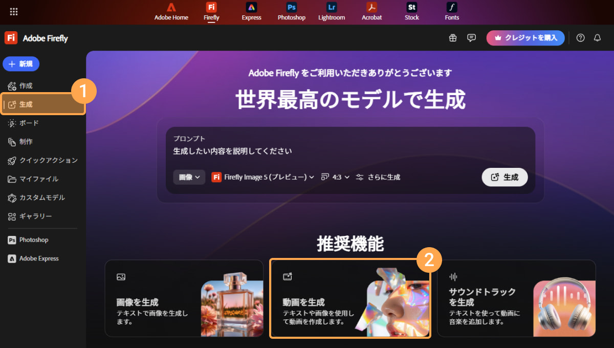画像だけでなく、動画や音声、さらにはデザインまで生成・編集でき、しかも、アドビ社が開発した生成AIなだけあって、高品質なクリエイティブを実現できます。