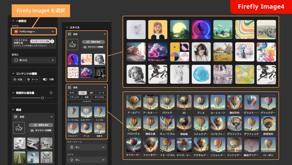 | 8 | 他社モデルへの切り替え | Adobe Fireflyでは、Fireflyのモデルだけでなく、Geminiの「Nano Banana」やOpenAI開発の「GPT Image」などのモデルも選択できます。 他の生成モデルも使えることから、他の生成モデルで生成したクリエイティブとの違いを比較できます。 ただし、Firefly以外のモデルを使う場合、生成物の安全性や商用利用に適しているかどうかは、ユーザー自身が確認する必要があります(Fireflyのモデルを使っていれば、その心配はありません)。 |