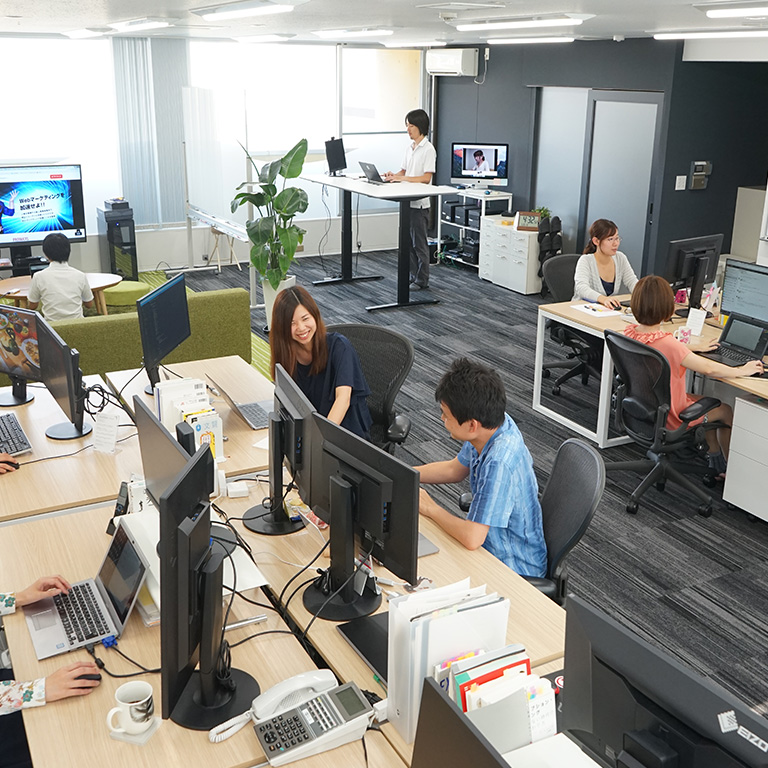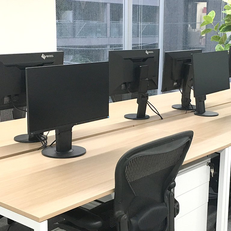 ワンフロアですが、会議室と執務エリアに分かれており、8人までのびのびと働ける広さで、フリーアドレスのデスクを採用しており、自由な席に座ることができます。